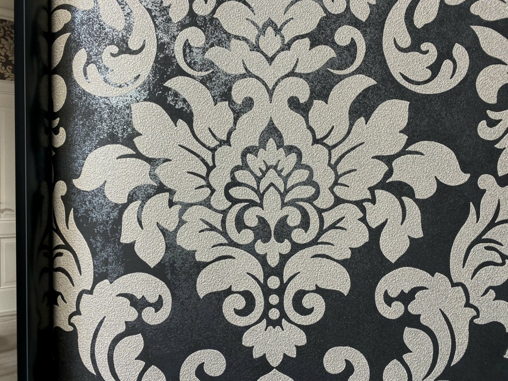 Farba a vzor: čierna s béžovým zámockým retro vzorom posiatym drobnými trblietkami. Povrch tapety je štruktúrovaný, hrubší.