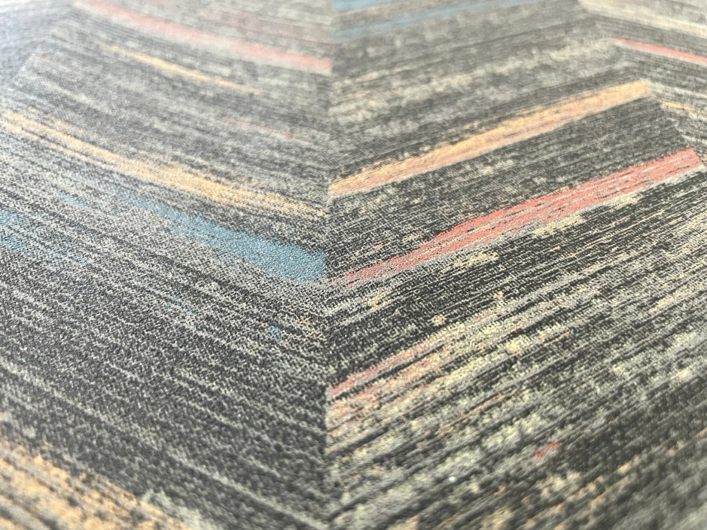 Farba a vzor: odtiene hnedej doplňujúce tyrkysovú, oranžovú a červenú, pílovitý motív skladaný z plátkov. Povrch tapety je hladký.